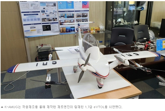 이러한 트렌드에 발맞춰 K-AMUG는 적층제조를 통해 제트엔진을 제작했으며, 이를 장착할 시제품으로 1.7m급 드론 ‘eVTOL’을 완성하고 시험비행 중에 있다.