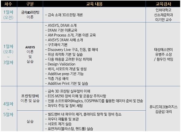 교육은 오는 2월3일부터 7일까지 진행되며 △금속 3D프린팅 개론(이기안 인하대 신소재공학과 교수) △앤시스(ANSYS)를 활용한 DfAM(적층제조특화설계) 이론 및 실습(태성에스엔이 유병주 소장·황우진 책임) △금속 3D프린팅 장비 운영 및 후처리 실습(김균섭 휴니드테크놀러지스 대리) 등으로 구성됐다.
